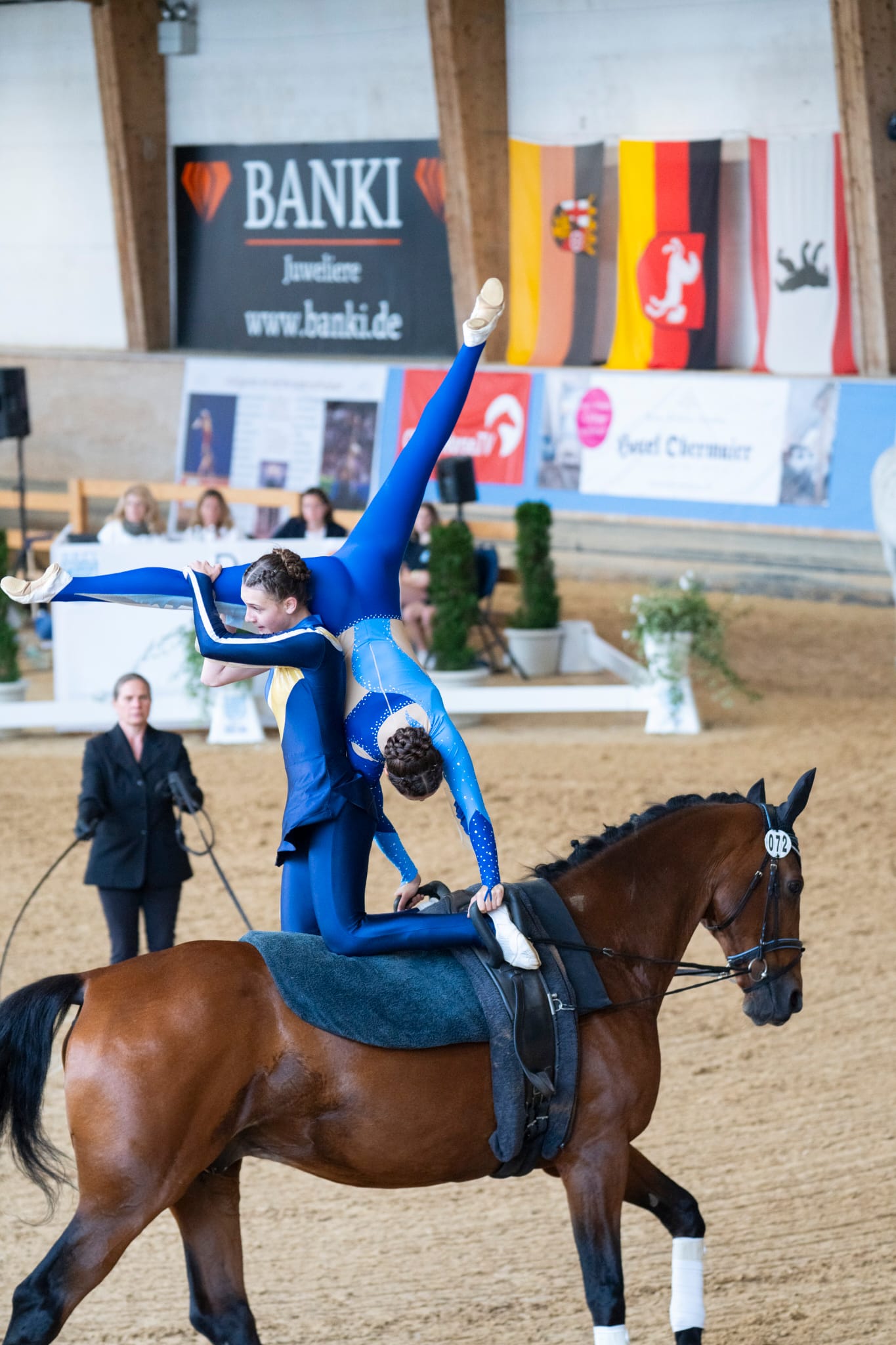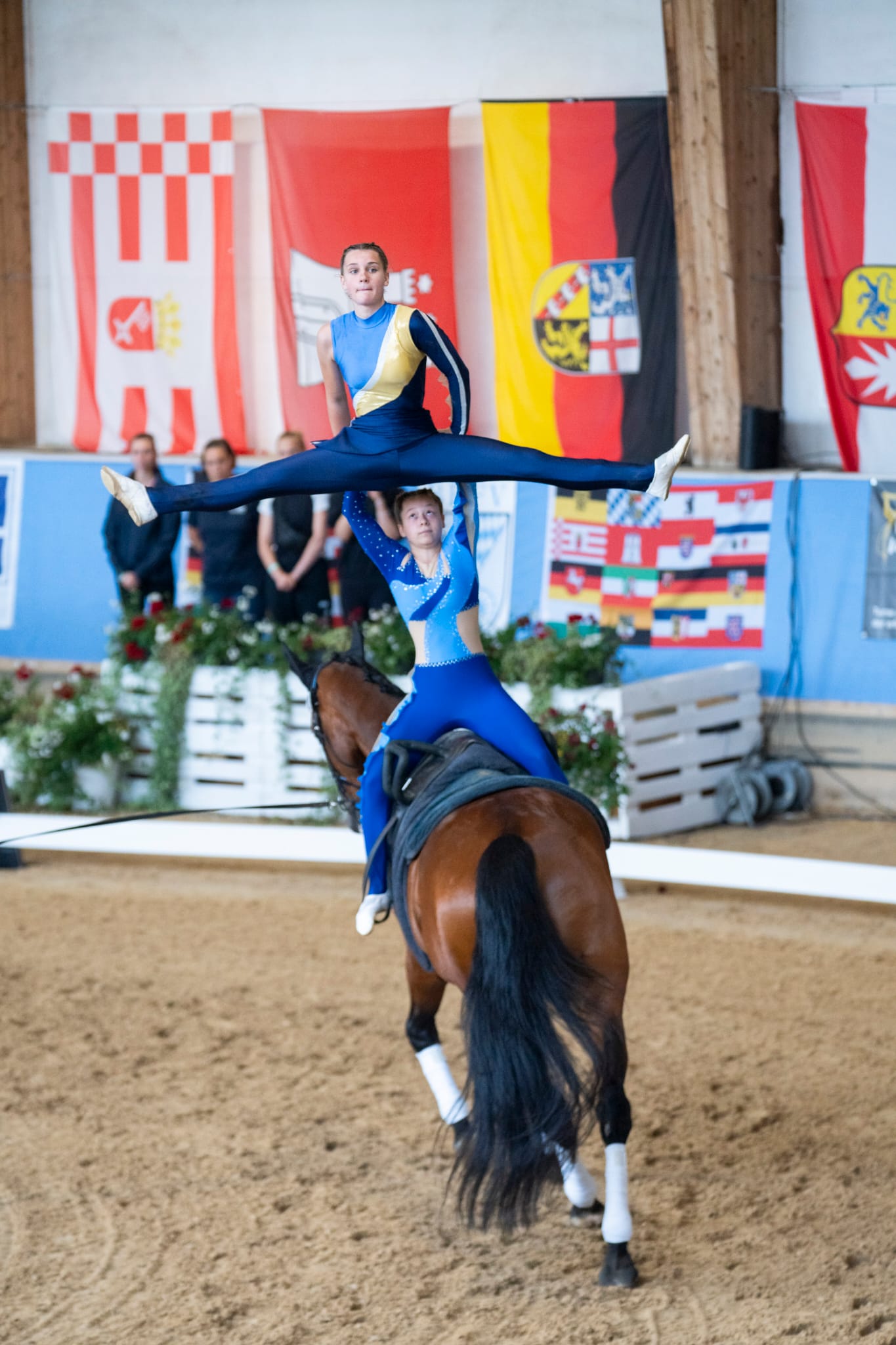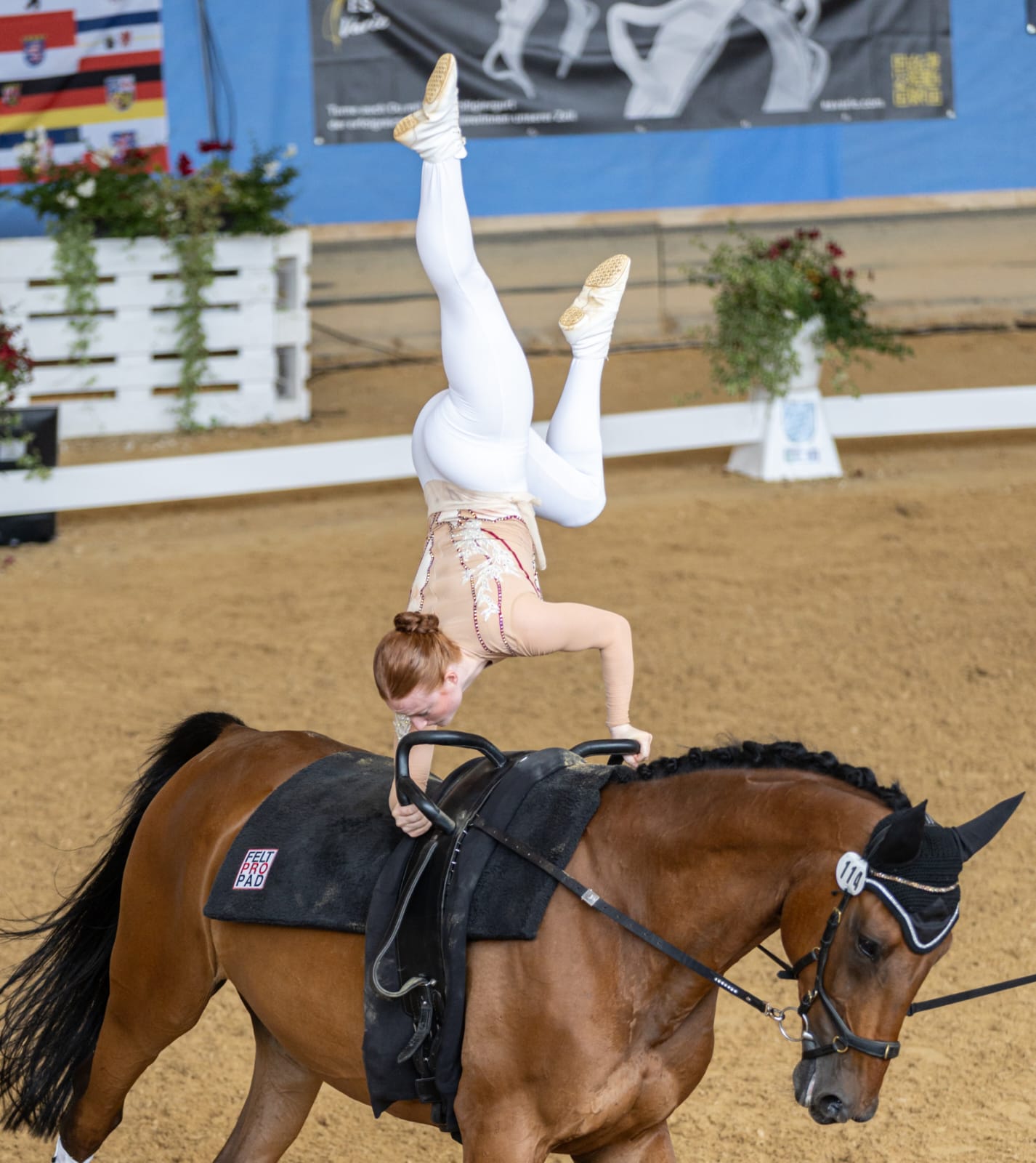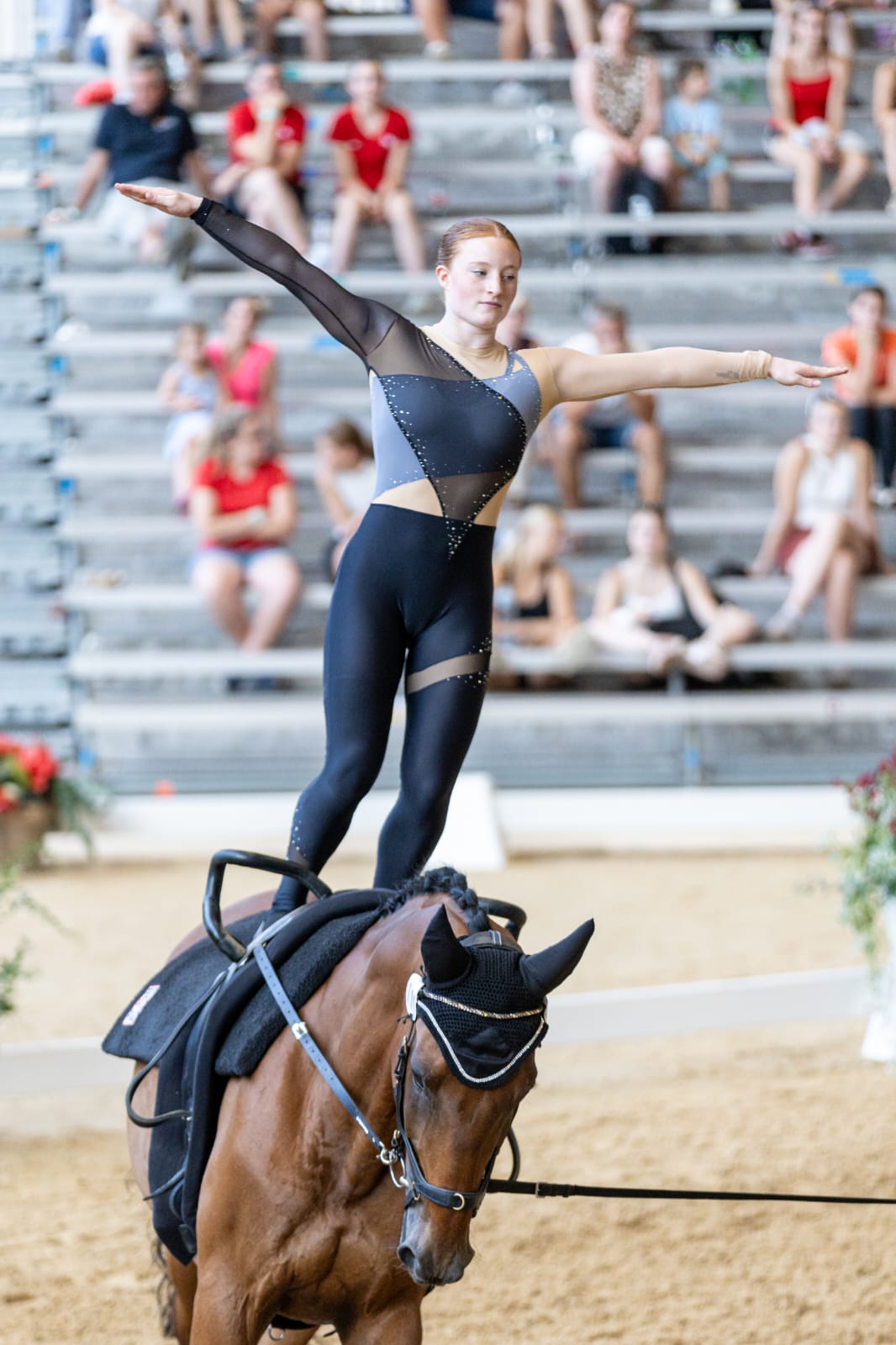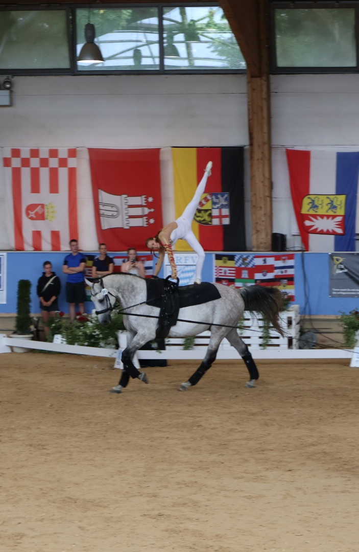 Im Finale der Junioreinzelvoltigierer ging Lilli Richter noch einmal mit Ihrem Pferd Schlawiner an den Start. Sie zeigte eine harmonische und ausdrucksstarke Kür. Leider hatte sie beim Radabgang eine Bodenberührung, weshalb sie leider ein paar Abzüge in Kauf nehmen musste.
