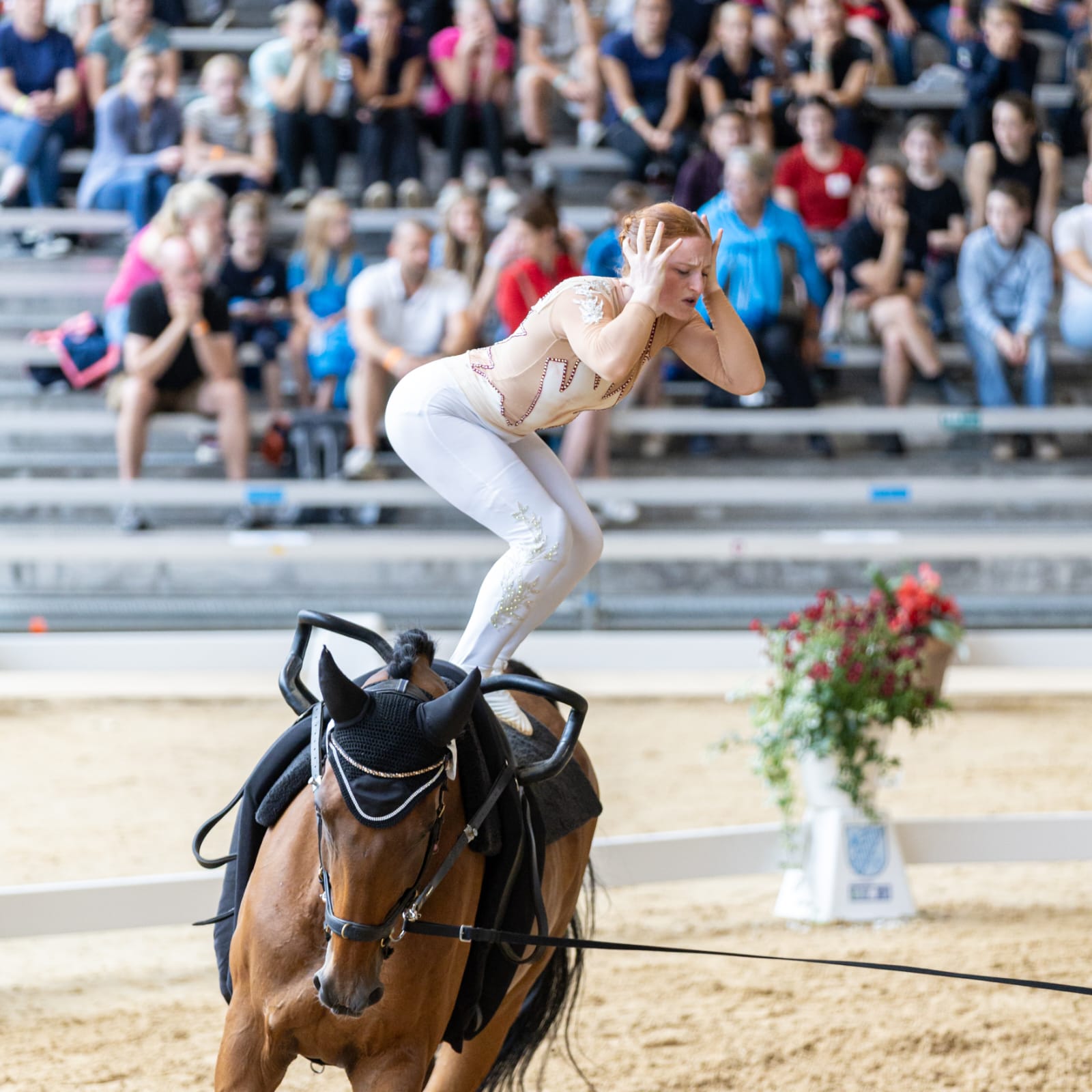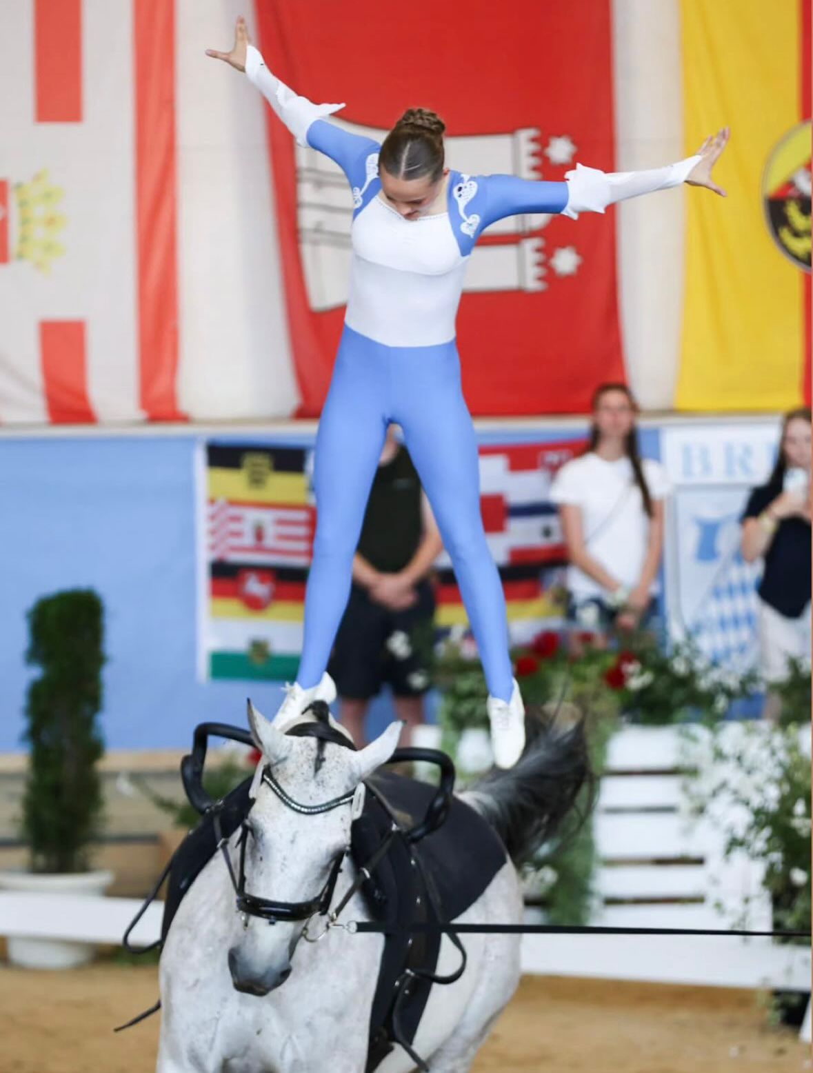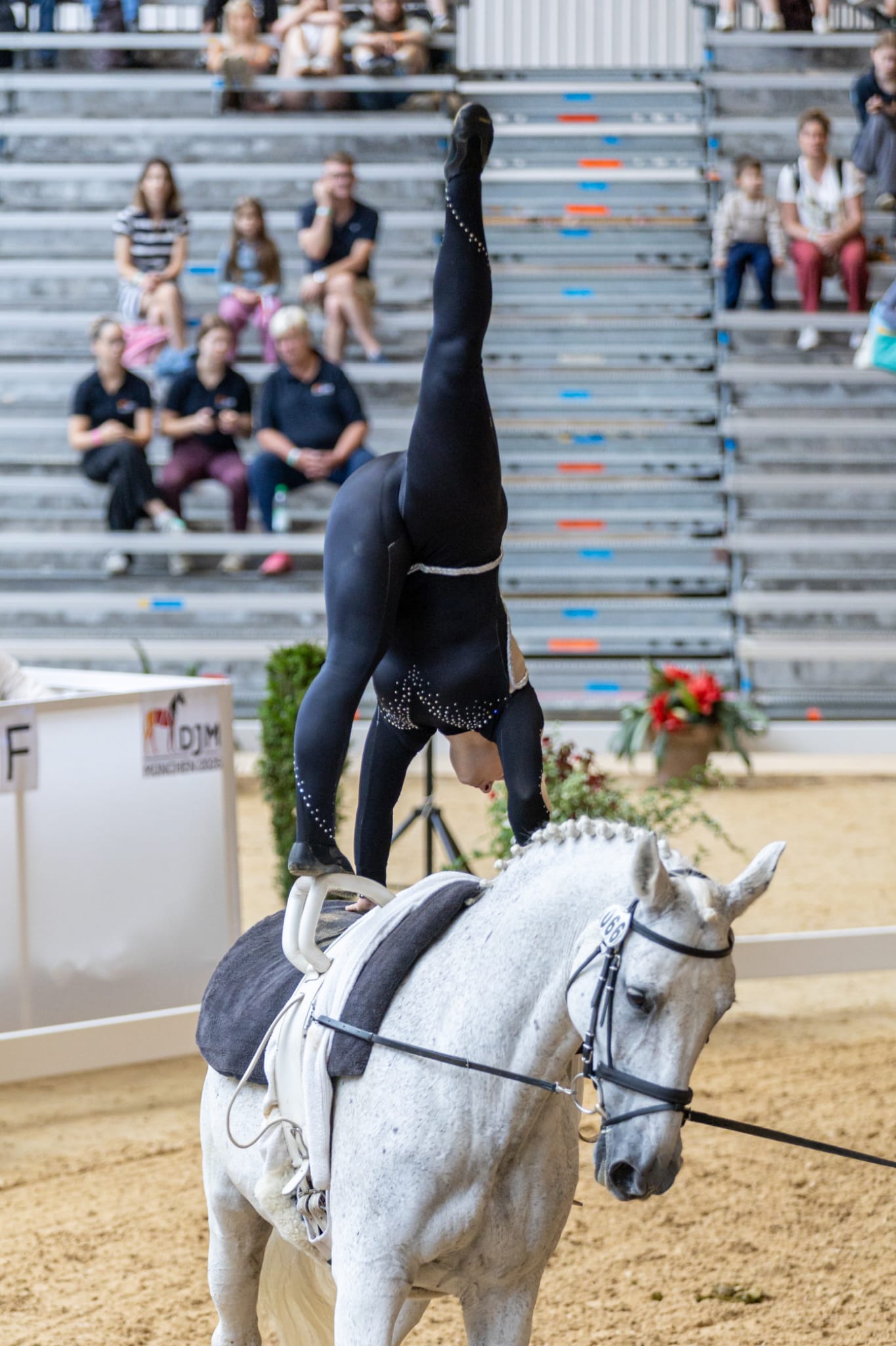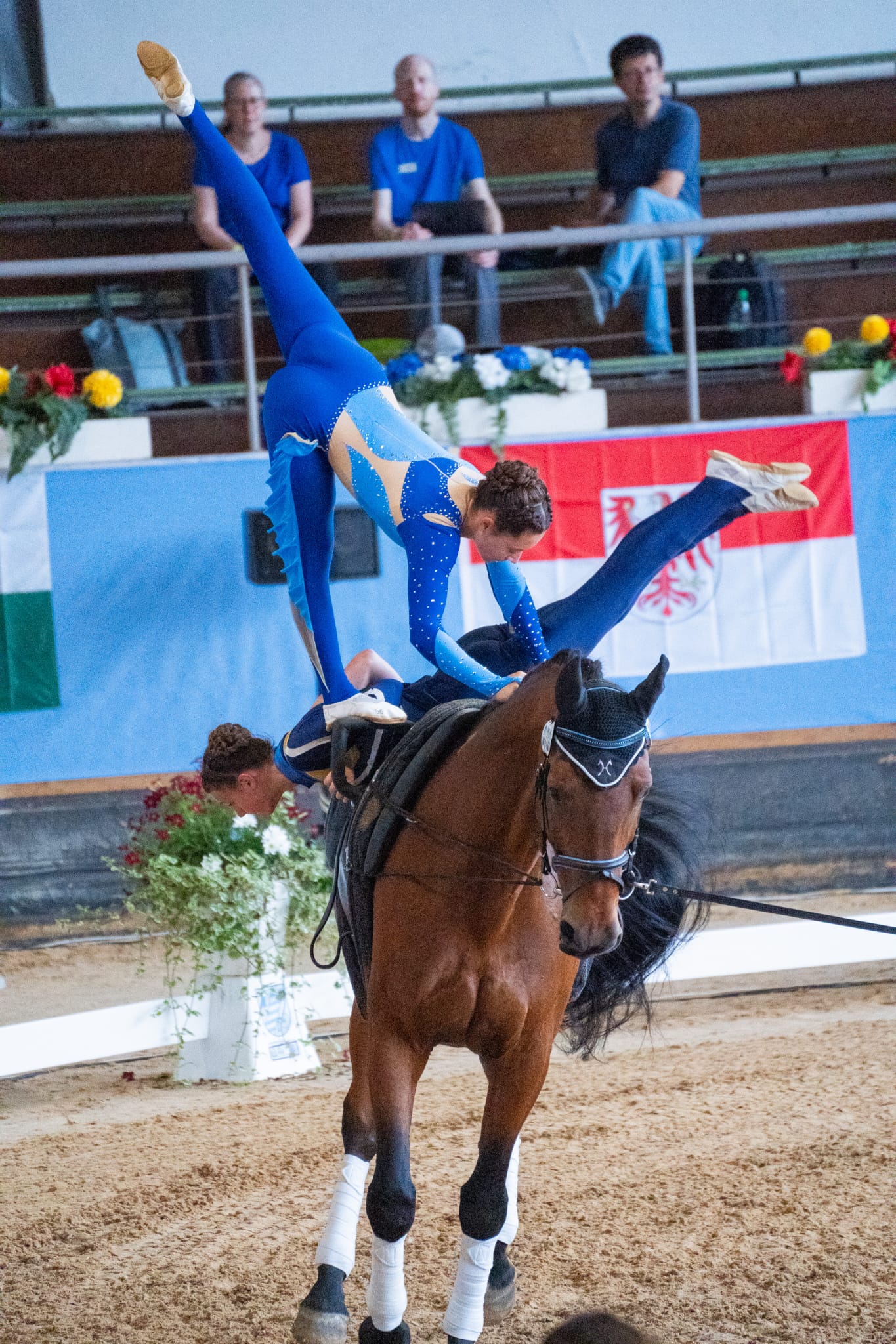 Im Finale der Junioreinzelvoltigierer ging Lilli Richter noch einmal mit Ihrem Pferd Schlawiner an den Start. Sie zeigte eine harmonische und ausdrucksstarke Kür. Leider hatte sie beim Radabgang eine Bodenberührung, weshalb sie leider ein paar Abzüge in Kauf nehmen musste.