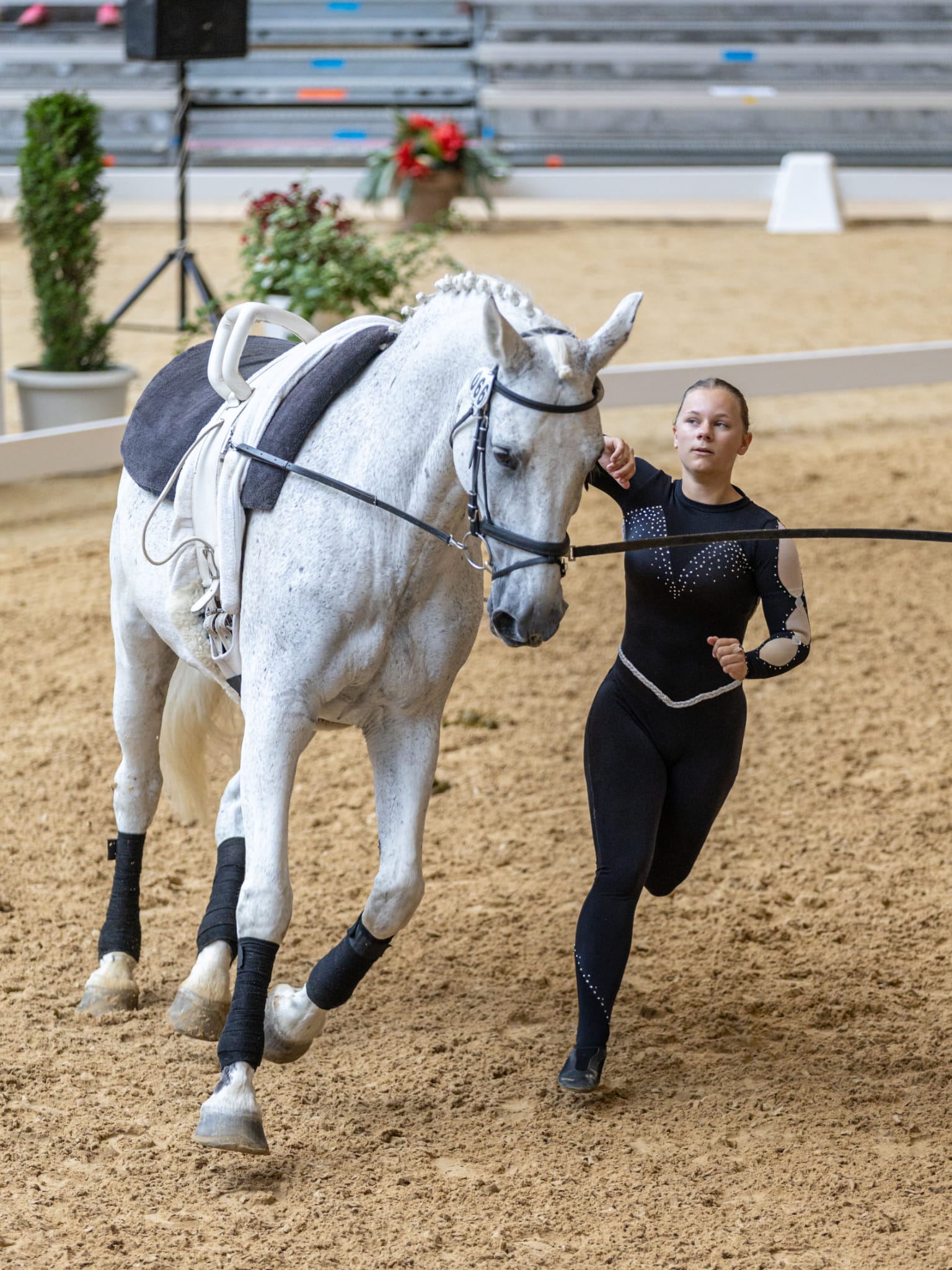 Samstag früh liefen Lilli Richter und Laura Köthe zur Einzelkür in den Zirkel ein. Laura Köthe konnte mit ihrem Pferd Exquisit ihre Trainingsleistung abrufen und eine gute Kür zeigen. Einen starken Anfang zeigen Lilli Richter und ihr Pferd Schlawiner. Leider fiel mitten in der Kür die Musik aus, was zu leichten Unsicherheiten führte. Sie beendete die Prüfung auf Rang 9 und sicherte sich damit die Teilnahme am Finale. Nach einer kurzen Mittagspause wurde es dann für das Juniorteam Merseburg mit der Gruppenkür ernst. Anfangs konnte die Gruppe ihre Trainingsleistung zeigen, jedoch schlichen sich im Mittelteil unnötige Fehler ein, weshalb sie den Umlauf mit einem 16. Platz beendeten. Damit haben sie um 0,018 Punkte knapp das Finale verpasst. Dennoch können zufrieden sie mit ihrem Debüt an einer Deutschen Jugendmeisterschaft sein. Den Abschluss des Tages machte noch einmal Eveline Pätz mit ihrer Kür. Zu ihrer Kürmusik “Alegria” turnte sie in gewohnt sauberer Manier und schloss ihren ersten U21-Start mit dem 14. Platz ab. Darauf kann sie stolz sein.