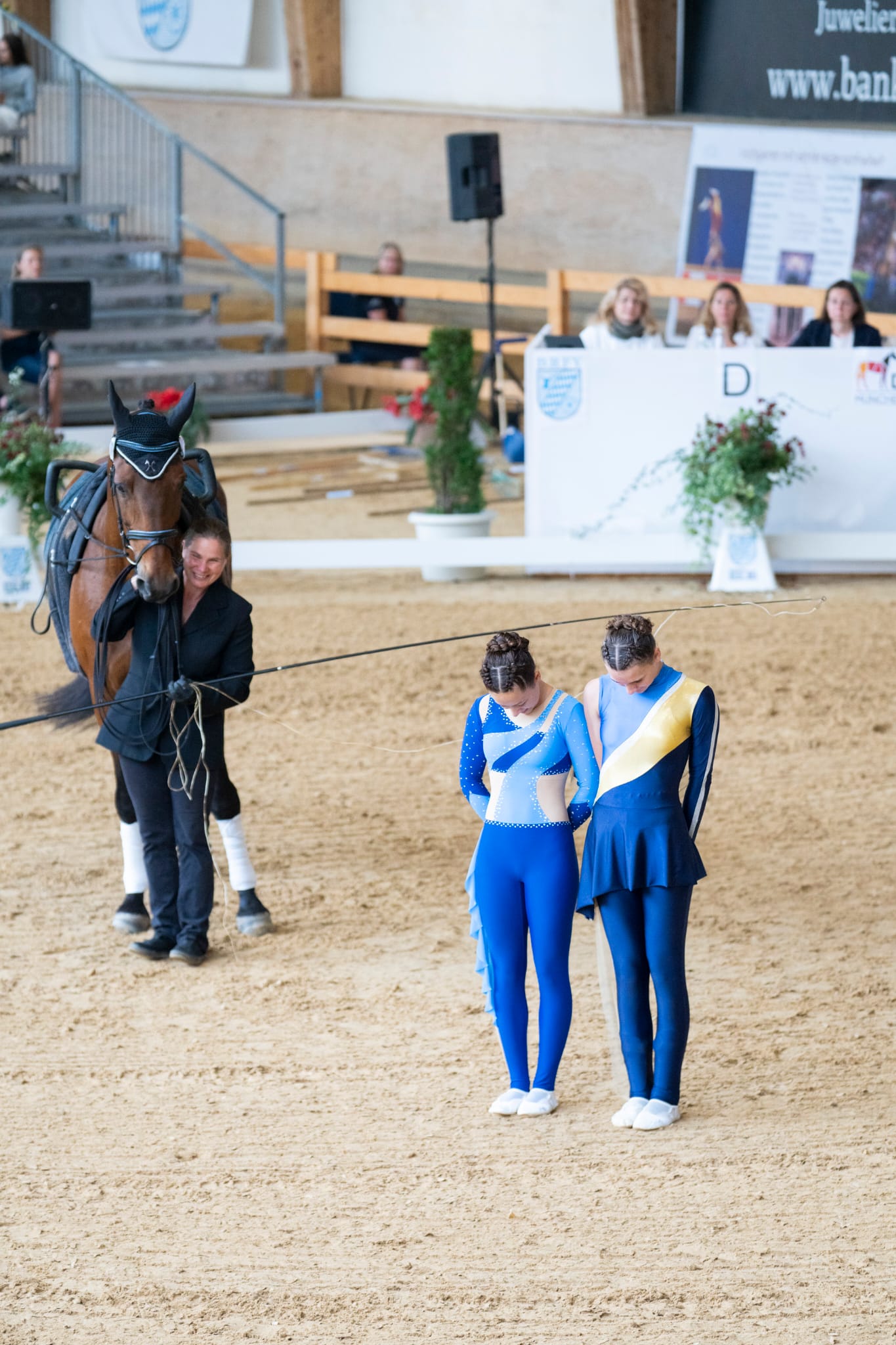 Am Nachmittag starteten Adina Huth und Paulina Stenger im Doppel. Für die beiden Voltigiererinnen aus Salzmünde war es die erste Doppelsaison. Dementsprechend war die Aufregung groß. Dennoch konnten sie eine saubere und schöne Kür zu ihrem Thema "Abba” zeigen und landeten unter den Top Ten des ersten Durchgangs. Nach dem Doppel absolvierte Eveline ihr erstes Technikprogramm. Der Fokus lag auf der Ausführung und Sauberkeit der Pflichtelemente, was ihr auch gut gelungen ist. Sie sicherte sich den 14. Rang. Bei der Siegerehrung wurde sie als jüngste Teilnehmerin in dieser Prüfung geehrt.